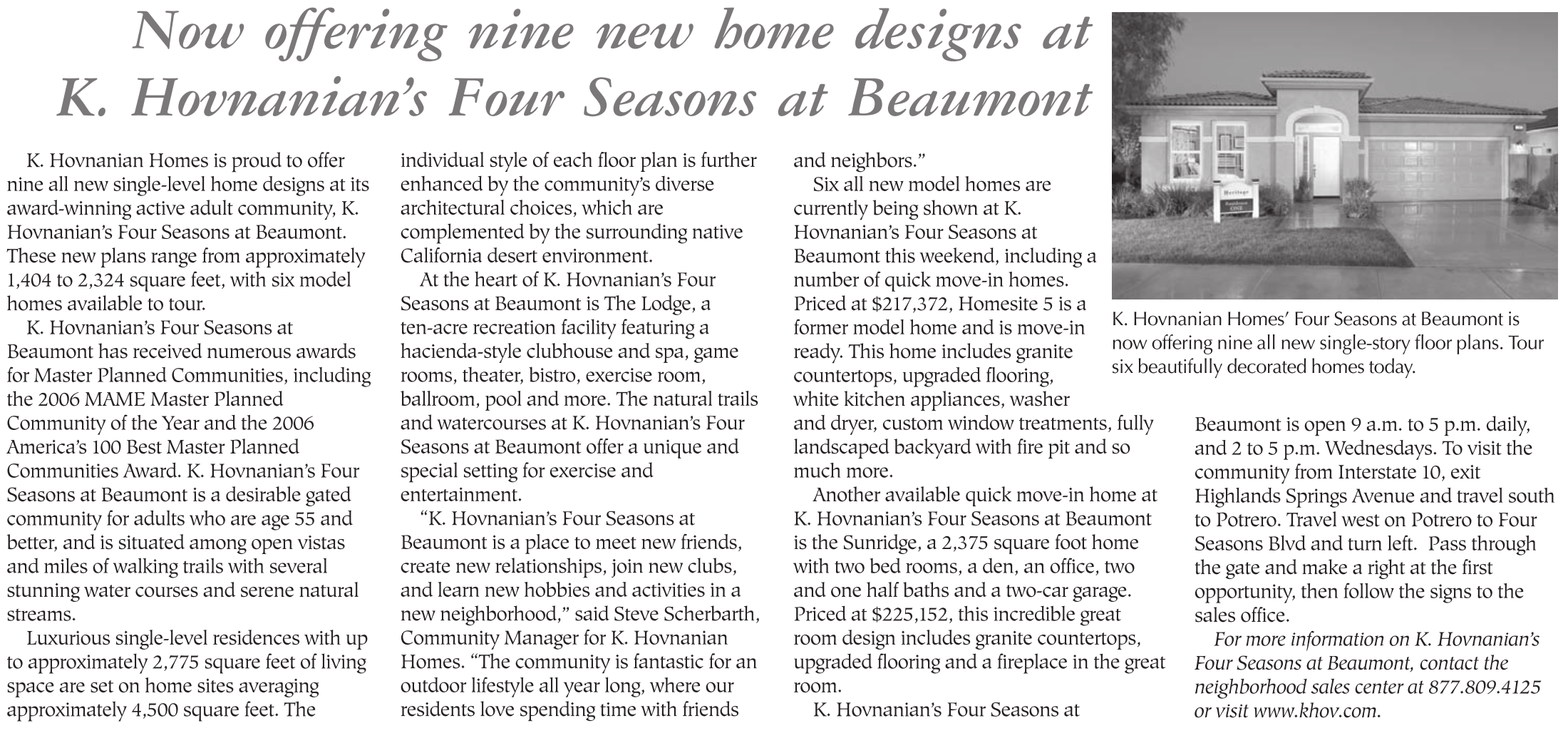 For more information on K. Hovnanian’s Four Seasons at Beaumont, contact the neighborhood sales center at 877.809.4125 or visit www.khov.com.