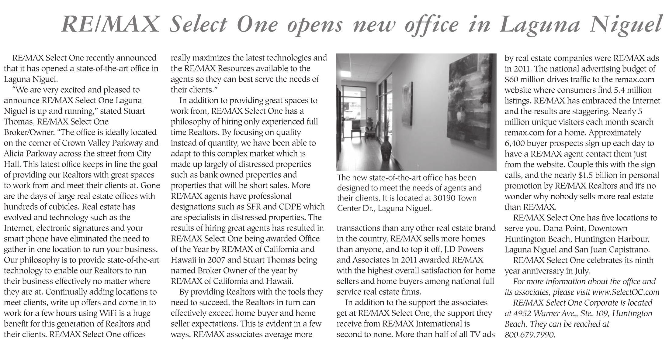 For more information about the office and its associates, please visit www.SelectOC.com RE/MAX Select One Corporate is located at 4952 Warner Ave., Ste. 109, Huntington Beach. They can be reached at 800.679.7990.
