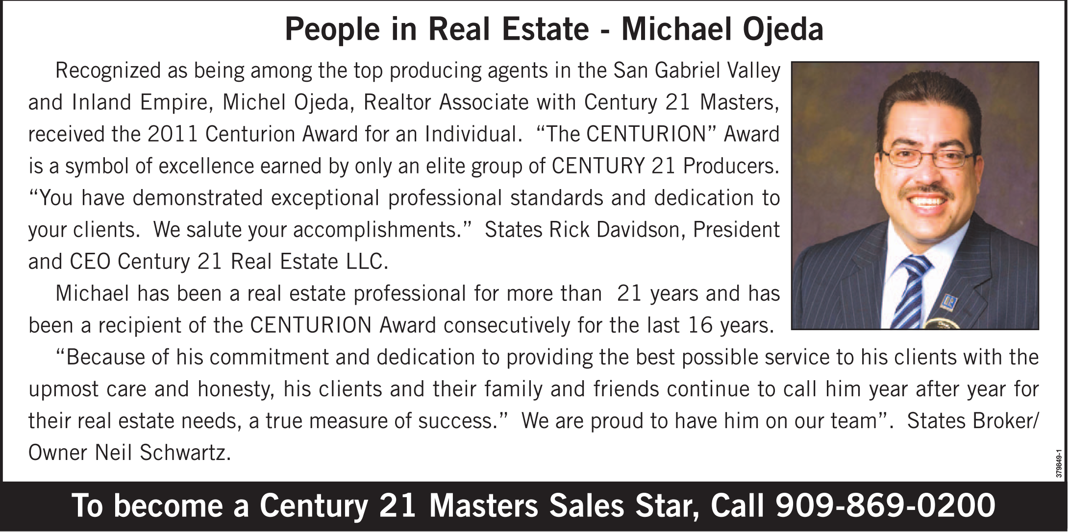 Recognized as being among the top producing agents in the San Gabriel Valley and Inland Empire, Michel Ojeda, Realtor Associate with Century 21 Masters, received the 2011 Centurion Award for an Individual. “The CENTURION” Award is a symbol of excellence earned by only an elite group of CENTURY 21 Producers. “You have demonstrated exceptional professional standards and dedication to your clients. We salute your accomplishments.” States Rick Davidson, President and CEO Century 21 Real Estate LLC.