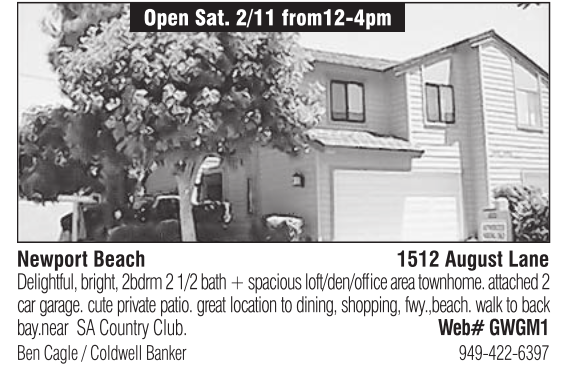 Newport Beach 1512 August Lane Delightful, bright, 2bdrm 2 1/2 bath + spacious loft/den/office area townhome. attached 2 car garage. cute private patio. great location to dining, shopping, fwy.,beach. walk to back bay.near SA Country Club. Web# GWGM1 Ben Cagle / Coldwell Banker 949-422-6397