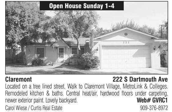 Claremont 222 S Dartmouth Ave Located on a tree lined street. Walk to Claremont Village, MetroLink & Colleges. Remodeled kitchen & baths. Central heat/air, hardwood floors under carpeting, newer exterior paint. Lovely backyard. Web# GVRC1 Carol Wiese / Curtis Real Estate 909-376-8972