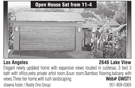 Los Angeles 2646 Lake View Elegant newly updated home with expansive views located in culdesac..3 bed 3 bath with office,extra private artist room,&sun room.Bamboo flooring,balcany with views.Three tier home,with lush landscaping. Web# GWGT1
