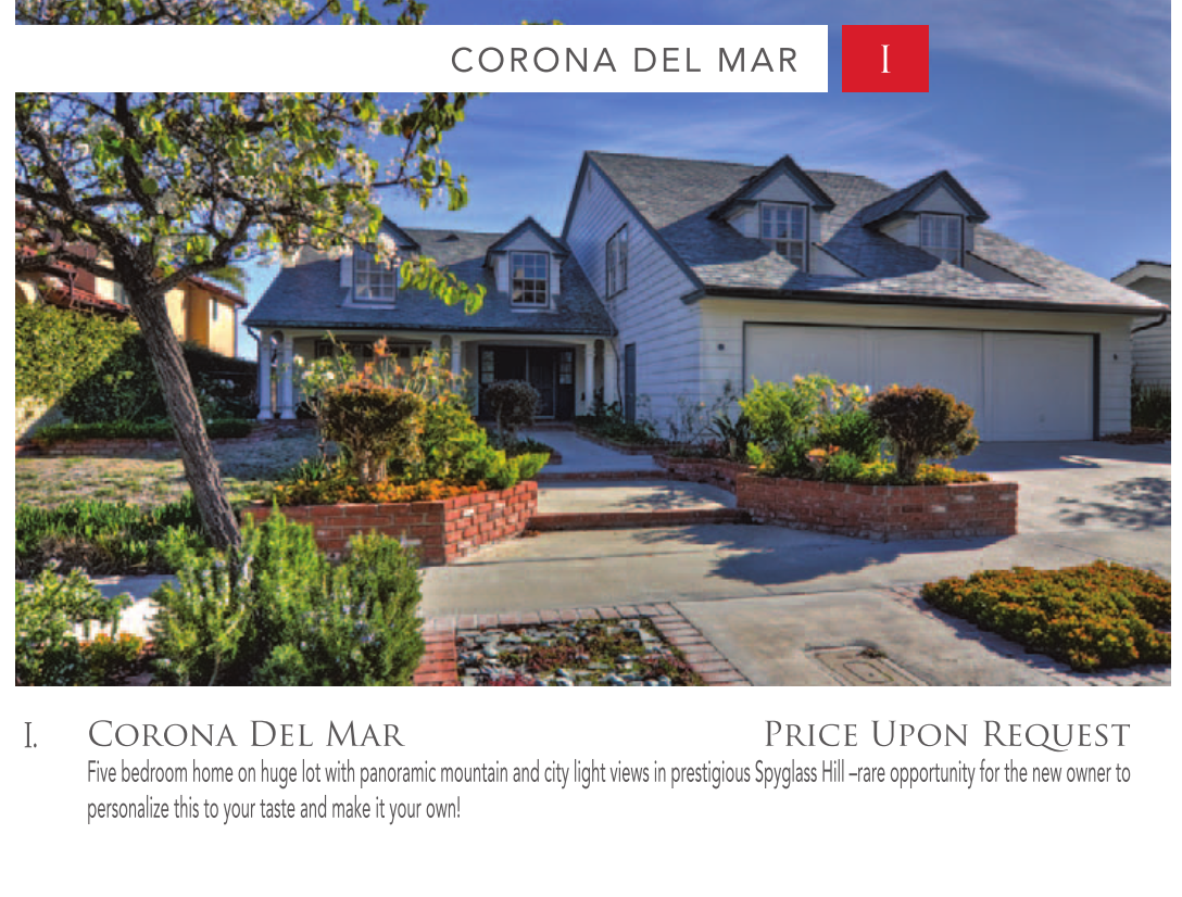 CORONA DEL MAR I I. Corona Del Mar Price Upon Request Five bedroom home on huge lot with panoramic mountain and city light views in prestigious Spyglass Hill –rare opportunity for the new owner to personalize this to your taste and make it your own! See also