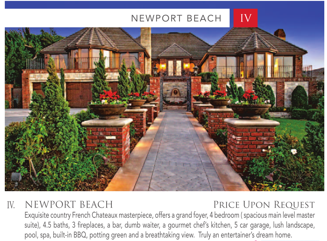 IV. NEWPORT BEACH Price Upon Request Exquisite country French Chateaux masterpiece, offers a grand foyer, 4 bedroom ( spacious main level master suite), 4.5 baths, 3 fireplaces, a bar, dumb waiter, a gourmet chef’s kitchen, 5 car garage, lush landscape, pool, spa, built-in BBQ, potting green and a breathtaking view. Truly an entertainer’s dream home.