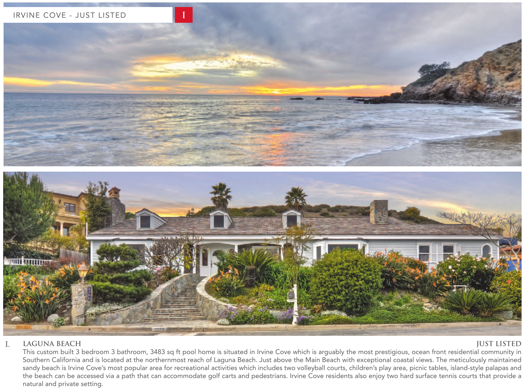IRVINE COVE - JUST LISTED I I. LAGUNA BEACH JUST LISTED This custom built 3 bedroom 3 bathroom, 3483 sq ft pool home is situated in Irvine Cove which is arguably the most prestigious, ocean front residential community in Southern California and is located at the northernmost reach of Laguna Beach. Just above the Main Beach with exceptional coastal views. The meticulously maintained sandy beach is Irvine Cove’s most popular area for recreational activities which includes two volleyball courts, children’s play area, picnic tables, island-style palapas and the beach can be accessed via a path that can accommodate golf carts and pedestrians. Irvine Cove residents also enjoy two hard surface tennis courts that provide a natural and private setting.