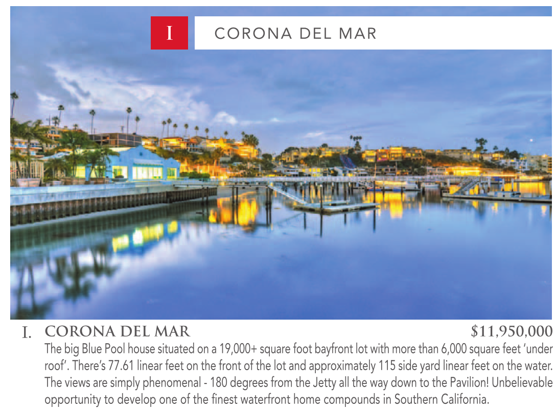 I CORONA DEL MAR I. CORONA DEL MAR $11,950,000 The big Blue Pool house situated on a 19,000+ square foot bayfront lot with more than 6,000 square feet ‘under roof’. There’s 77.61 linear feet on the front of the lot and approximately 115 side yard linear feet on the water. The views are simply phenomenal - 180 degrees from the Jetty all the way down to the Pavilion! Unbelievable opportunity to develop one of the finest waterfront home compounds in Southern California. See also