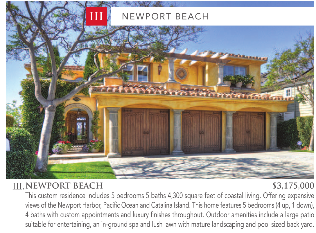 III NEWPORT BEACH III. NEWPORT BEACH $3,175,000 This custom residence includes 5 bedrooms 5 baths 4,300 square feet of coastal living. Offering expansive views of the Newport Harbor, Pacific Ocean and Catalina Island. This home features 5 bedrooms (4 up, 1 down), 4 baths with custom appointments and luxury finishes throughout. Outdoor amenities include a large patio suitable for entertaining, an in-ground spa and lush lawn with mature landscaping and pool sized back yard. See also