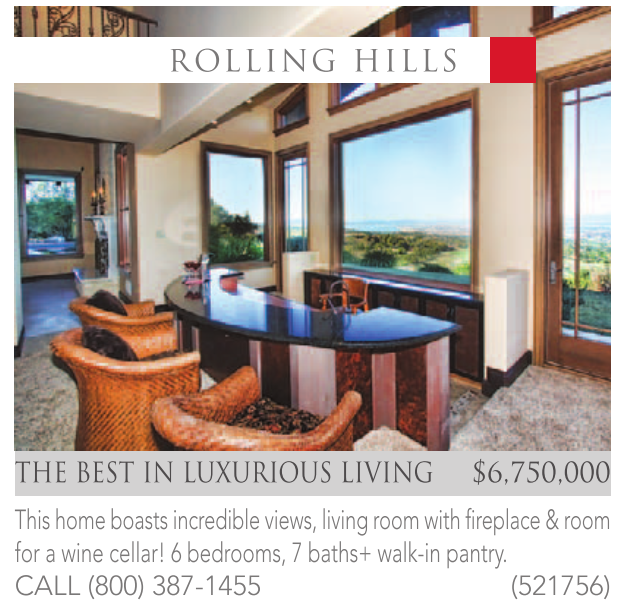 THE BEST IN LUXURIOUS LIVING $6,750,000 This home boasts incredible views, living room with fireplace & room for a wine cellar! 6 bedrooms, 7 baths+ walk-in pantry. CALL (800) 387-1455 (521756)