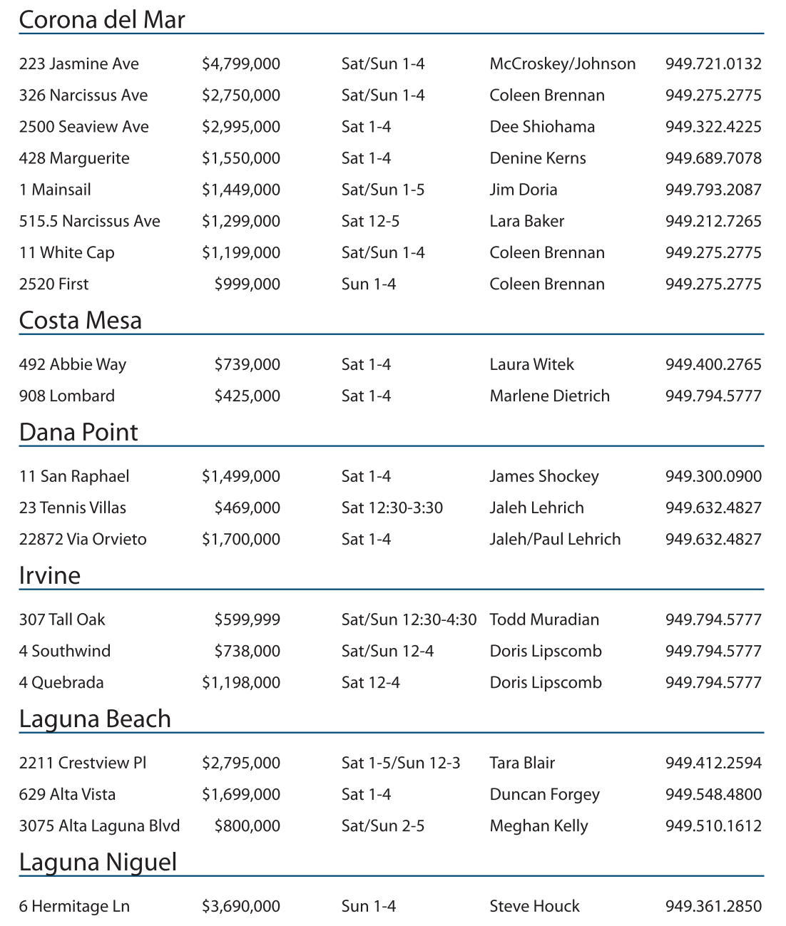 428 Marguerite $1,550,000 Sat 1-4 Denine Kerns 949.689.7078 1 Mainsail $1,449,000 Sat/Sun 1-5 Jim Doria 949.793.2087 515.5 Narcissus Ave $1,299,000 Sat 12-5 Lara Baker 949.212.7265 11 White Cap $1,199,000 Sat/Sun 1-4 Coleen Brennan 949.275.2775 2520 First $999,000 Sun 1-4 Coleen Brennan 949.275.2775