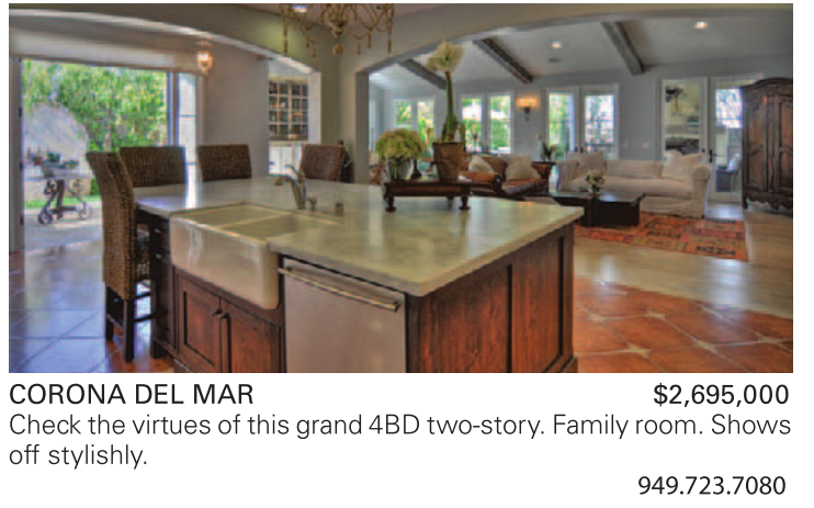 CORONA DEL MAR $2,695,000 Check the virtues of this grand 4BD two-story. Family room. Shows off stylishly.