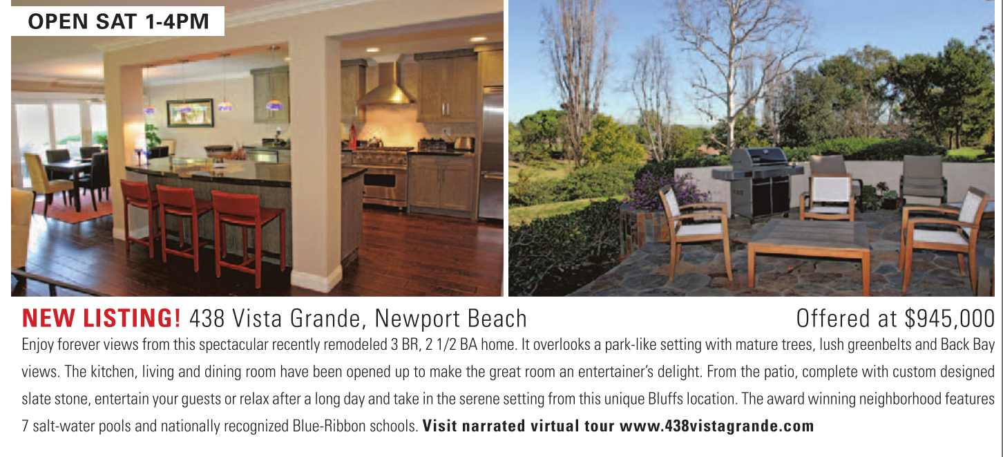 OPEN SAT 1-4PM NEW LISTING! 438 Vista Grande, Newport Beach Offered at $945,000 Enjoy forever views from this spectacular recently remodeled 3 BR, 2 1/2 BA home. It overlooks a park-like setting with mature trees, lush greenbelts and Back Bay views. The kitchen, living and dining room have been opened up to make the great room an entertainer’s delight. From the patio, complete with custom designed slate stone, entertain your guests or relax after a long day and take in the serene setting from this unique Bluffs location. The award winning neighborhood features 7 salt-water pools and nationally recognized Blue-Ribbon schools. Visit narrated virtual tour www.438vistagrande.com