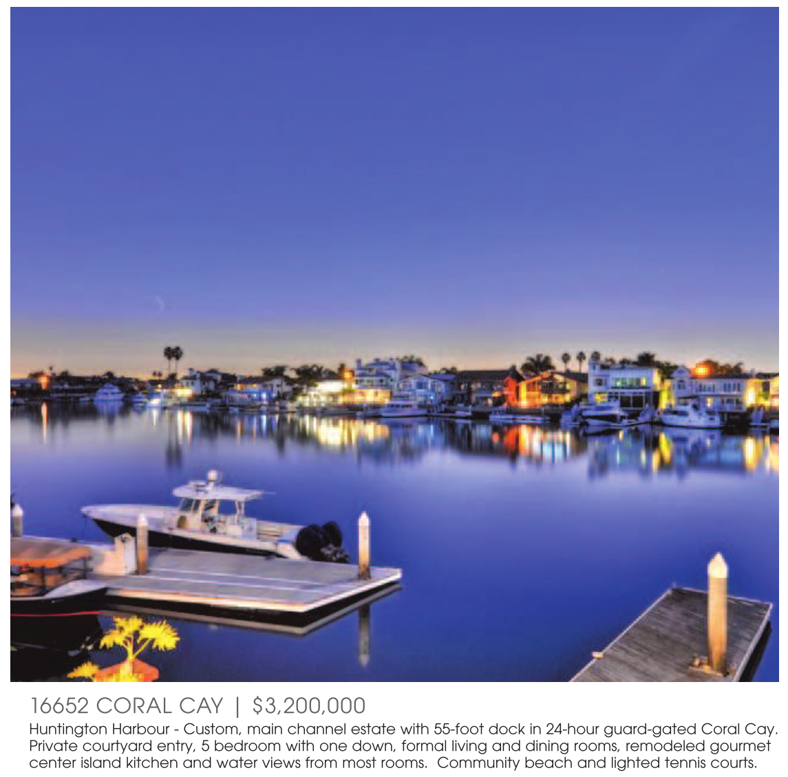 Huntington Harbour - Custom, main channel estate with 55-foot dock in 24-hour guard-gated Coral Cay. Private courtyard entry, 5 bedroom with one down, formal living and dining rooms, remodeled gourmet center island kitchen and water views from most rooms. Community beach and lighted tennis courts.