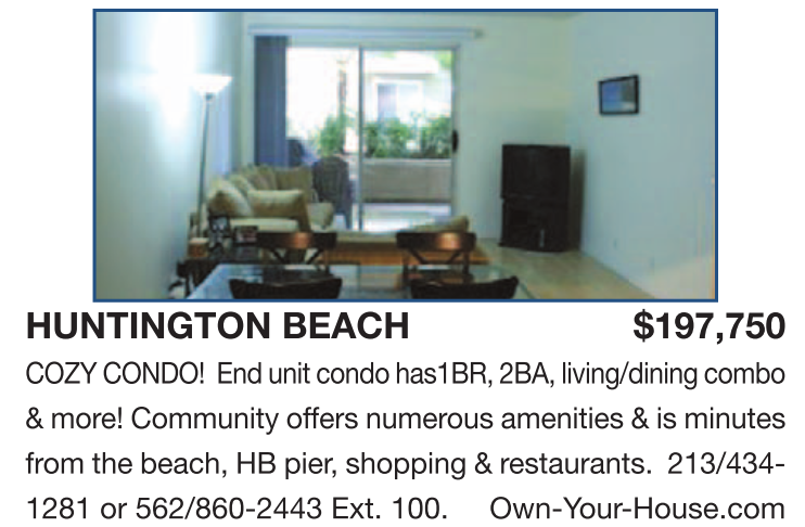 HUNTINGTON BEACH $197,750 COZY CONDO! End unit condo has1BR, 2BA, living/dining combo & more! Community offers numerous amenities & is minutes from the beach, HB pier, shopping & restaurants. 213/434- 1281 or 562/860-2443 Ext. 100. Own-Your-House.com