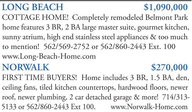 LONG BEACH $1,090,000 COTTAGE HOME! Completely remodeled Belmont Park home features 3 BR, 2 BA large master suite, gourmet kitchen, sunny atrium, high end stainless steel appliances & too much to mention! 562/569-2752 or 562/860-2443 Ext. 100 www.Long-Beach-Home.com NORWALK $270,000 FIRST TIME BUYERS! Home includes 3 BR, 1.5 BA, den, ceiling fans, tiled kitchen countertops, hardwood floors, newer roof, newer plumbing, 2 car detached garage & more! 714/313- 5133 or 562/860-2443 Ext 100. www.Norwalk-Home.com