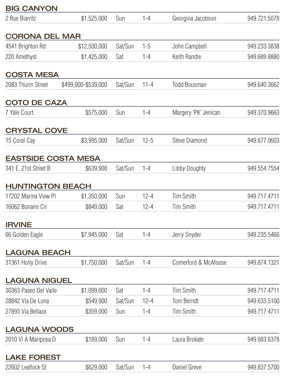 CORONA DEL MAR 4541 Brighton Rd $12,500,000 Sat/Sun 1-5 John Campbell 949.233.3838 220 Amethyst $1,425,000 Sat 1-4 Keith Randle 949.689.8880