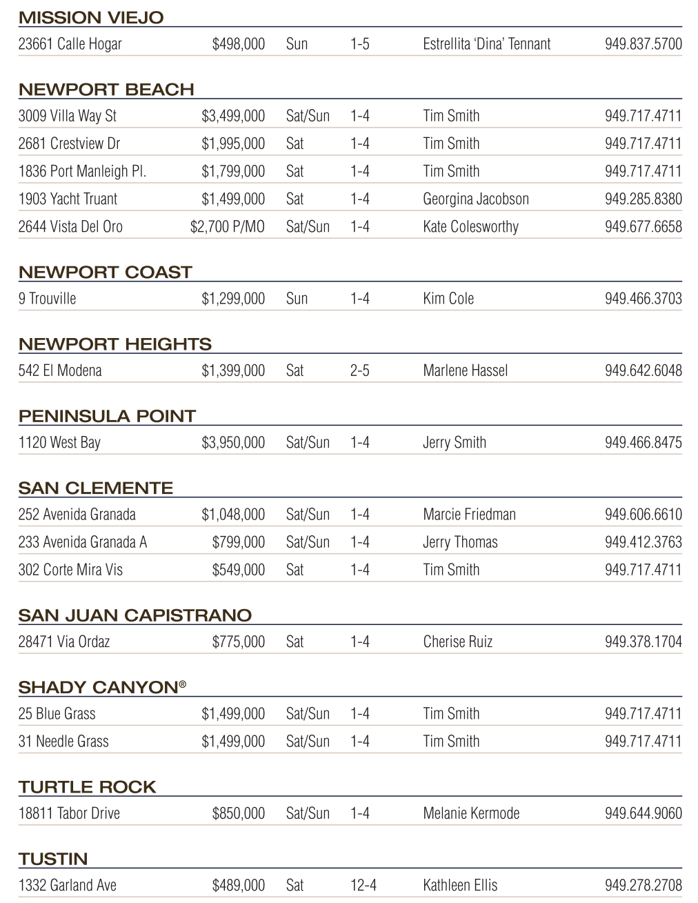 25 Blue Grass $1,499,000 Sat/Sun 1-4 Tim Smith 949.717.4711