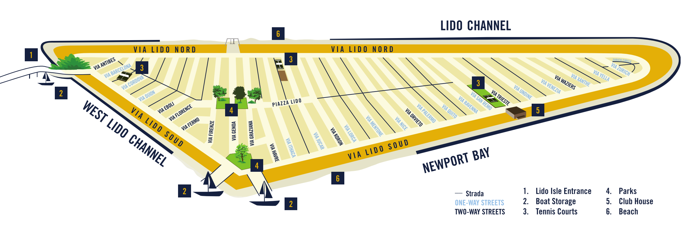 1. Lido Isle Entrance 2. Boat Storage 3. Tennis Courts