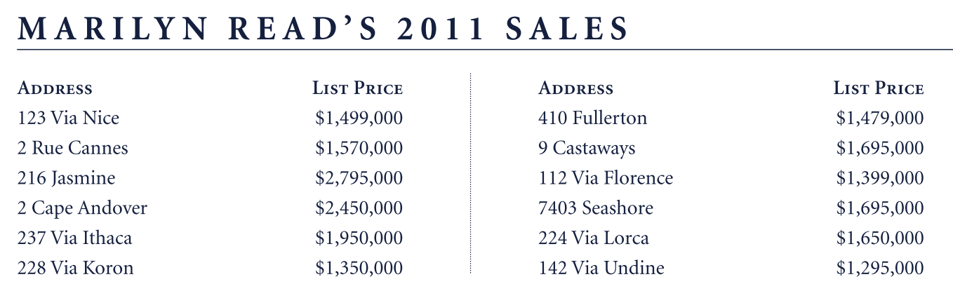 M A R I L Y N R E A D ’ S 2 0 1 1 S A L E S Address List Price 123 Via Nice $1,499,000 2 Rue Cannes $1,570,000 216 Jasmine $2,795,000 2 Cape Andover $2,450,000 237 Via Ithaca $1,950,000 228 Via Koron $1,350,000 Address List Price 410 Fullerton $1,479,000 9 Castaways $1,695,000 112 Via Florence $1,399,000 7403 Seashore $1,695,000 224 Via Lorca $1,650,000 142 Via Undine $1,295,000