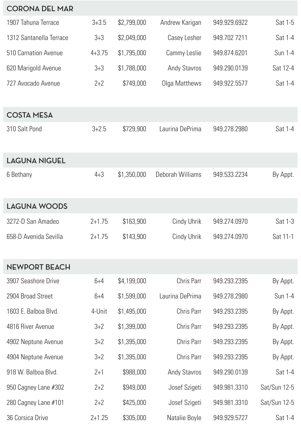510 Carnation Avenue 4+3.75 $1,795,000 Cammy Leslie 949.874.6201 Sun 1-4