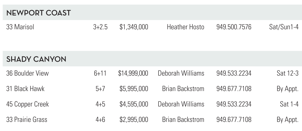 NEWPORT COAST 33 Marisol 3+2.5 $1,349,000 Heather Hosto 949.500.7576 Sat/Sun1-4 SHADY CANYON 36 Boulder View 6+11 $14,999,000 Deborah Williams 949.533.2234 Sat 12-3 31 Black Hawk 5+7 $5,995,000 Brian Backstrom 949.677.7108 By Appt. 45 Copper Creek 4+5 $4,595,000 Deborah Williams 949.533.2234 Sat 1-4 33 Prairie Grass 4+6 $2,995,000 Brian Backstrom 949.677.7108 By Appt.