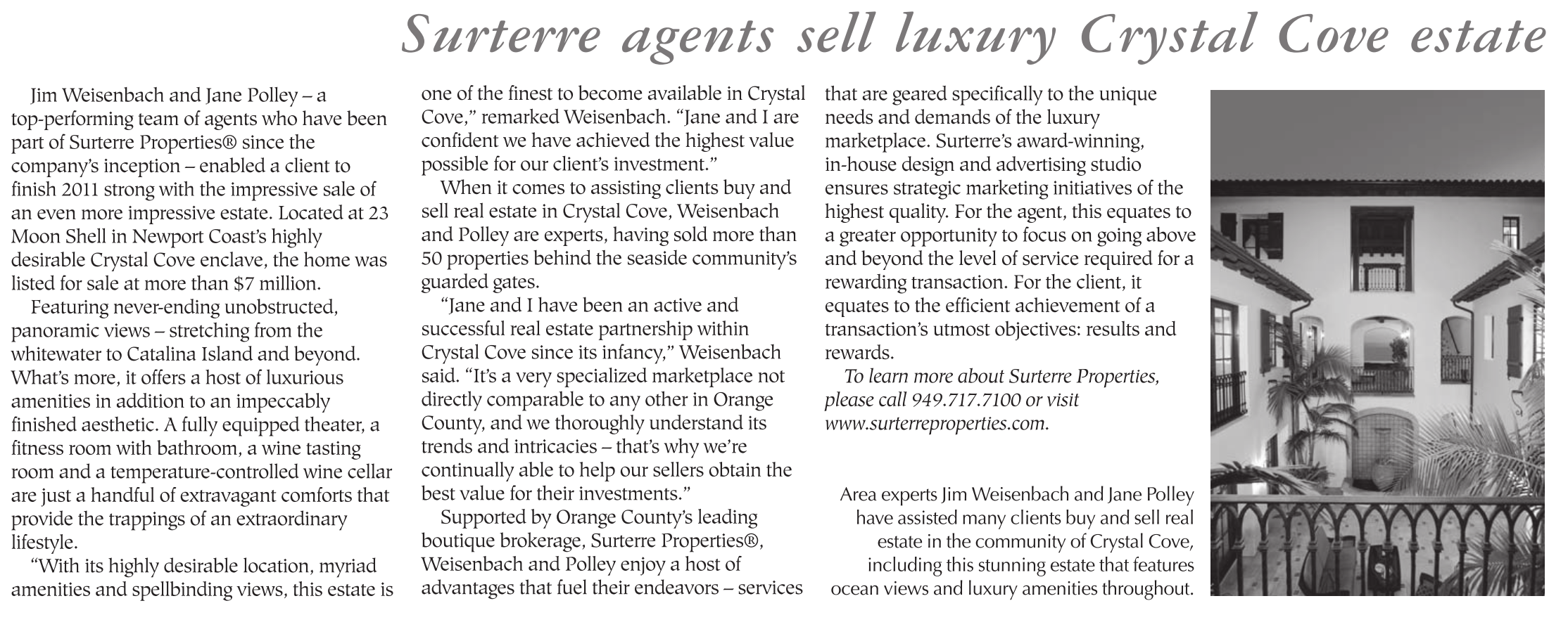 Jim Weisenbach and Jane Polley – a top-performing team of agents who have been part of Surterre Properties® since the company’s inception – enabled a client to finish 2011 strong with the impressive sale of an even more impressive estate. Located at 23 Moon Shell in Newport Coast’s highly desirable Crystal Cove enclave, the home was listed for sale at more than $7 million.