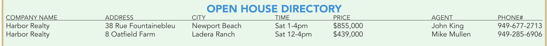 OPEN HOUSE DIRECTORY COMPANY NAME ADDRESS CITY TIME PRICE AGENT PHONE# Harbor Realty 38 Rue Fountainebleu Newport Beach Sat 1-4pm $855,000 John King 949-677-2713 Harbor Realty 8 Oatfield Farm Ladera Ranch Sat 12-4pm $439,000 Mike Mullen 949-285-6906
