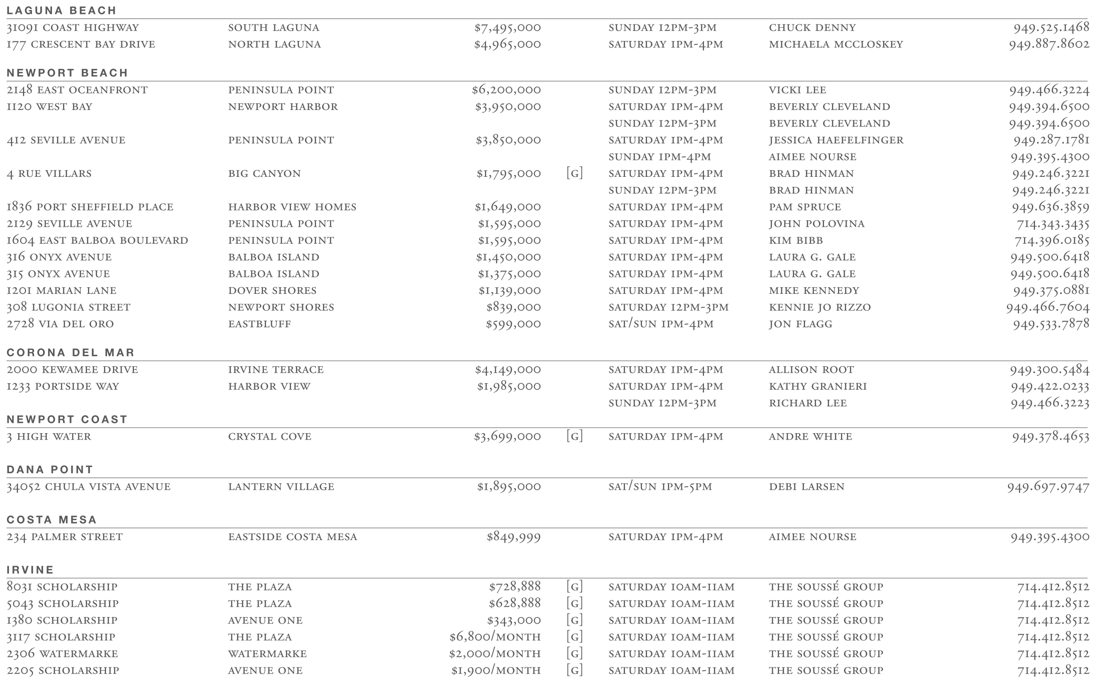 LAGUNA BEACH 31091 coast highway south laguna $7,495,000 sunday 12pm-3pm chuck denny 949.525.1468 177 crescent bay drive north laguna $4,965,000 saturday 1pm-4pm michaela mccloskey 949.887.8602 NEWPORT BEACH 2148 east oceanfront peninsula point $6,200,000 sunday 12pm-3pm vicki lee 949.466.3224 1120 west bay newport harbor $3,950,000 saturday 1pm-4pm beverly cleveland 949.394.6500 sunday 12pm-3pm beverly cleveland 949.394.6500 412 seville avenue peninsula point $3,850,000 saturday 1pm-4pm jessica haefelfinger 949.287.1781 sunday 1pm-4pm aimee nourse 949.395.4300 4 rue villars big canyon $1,795,000 [g] saturday 1pm-4pm brad hinman 949.246.3221 sunday 12pm-3pm brad hinman 949.246.3221 1836 port sheffield place harbor view homes $1,649,000 saturday 1pm-4pm pam spruce 949.636.3859 2129 seville avenue peninsula point $1,595,000 saturday 1pm-4pm john polovina 714.343.3435 1604 east balboa boulevard peninsula point $1,595,000 saturday 1pm-4pm kim bibb 714.396.0185 316 onyx avenue balboa island $1,450,000 saturday 1pm-4pm laura g. gale 949.500.6418 315 onyx avenue balboa island $1,375,000 saturday 1pm-4pm laura g. gale 949.500.6418 1201 marian lane dover shores $1,139,000 saturday 1pm-4pm mike kennedy 949.375.0881 308 lugonia street newport shores $839,000 saturday 12pm-3pm kennie jo rizzo 949.466.7604 2728 via del oro eastbluff $599,000 sat/sun 1pm-4pm jon flagg 949.533.7878