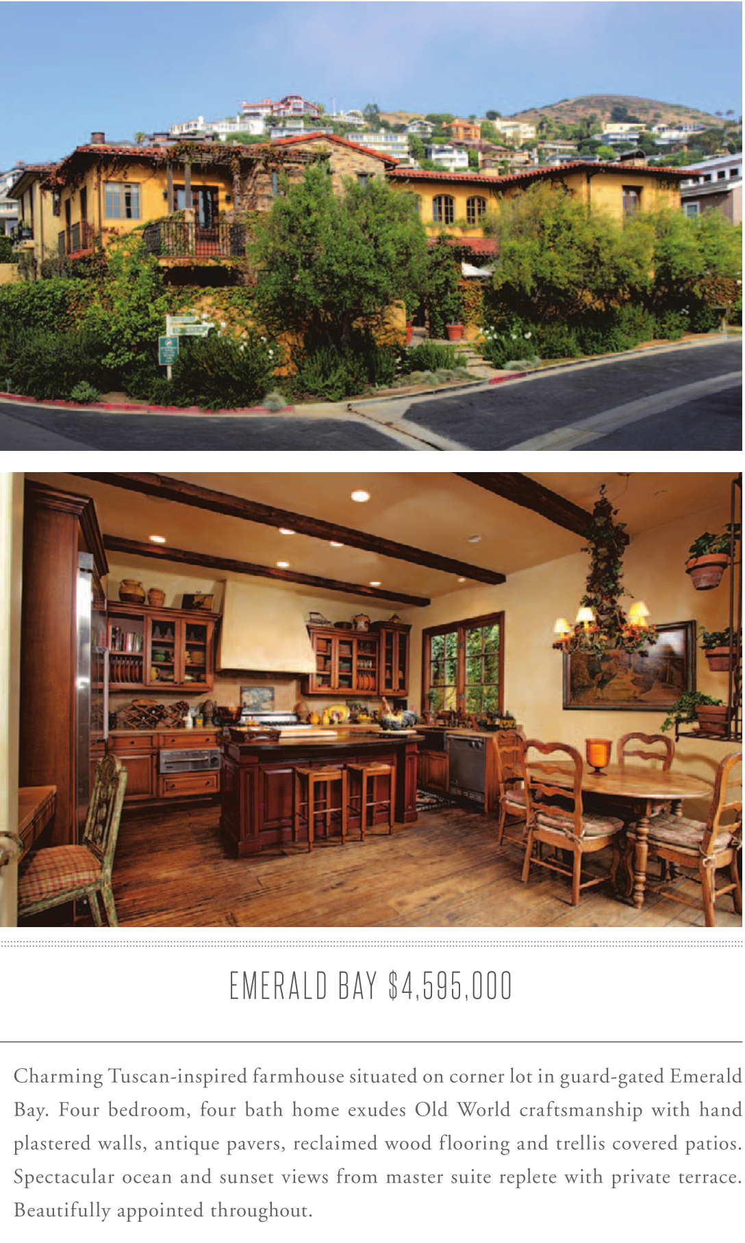 EMERALD BAY $4,595,000 Charming Tuscan-inspired farmhouse situated on corner lot in guard-gated Emerald Bay. Four bedroom, four bath home exudes Old World craftsmanship with hand plastered walls, antique pavers, reclaimed wood flooring and trellis covered patios. Spectacular ocean and sunset views from master suite replete with private terrace. Beautifully appointed throughout.