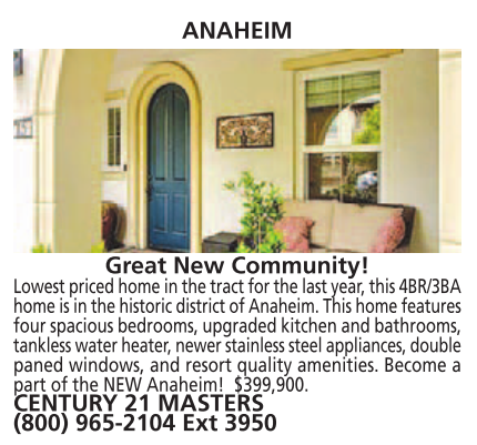 Lowest priced home in the tract for the last year, this 4BR/3BA home is in the historic district of Anaheim. This home features four spacious bedrooms, upgraded kitchen and bathrooms, tankless water heater, newer stainless steel appliances, double paned windows, and resort quality amenities. Become a part of the NEW Anaheim! $399,900. CENTURY 21 MASTERS (800) 965-2104 Ext 3950