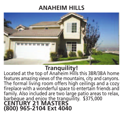 ANAHEIM HILLS Tranquility! Located at the top of Anaheim Hills this 3BR/3BA home features amazing views of the mountains, city and canyons. The formal living room offers high ceilings and a cozy fireplace with a wonderful space to entertain friends and family. Also included are two large patio areas to relax, barbeque and enjoy the tranquility. $375,000 CENTURY 21 MASTERS (800) 965-2104 Ext 4040