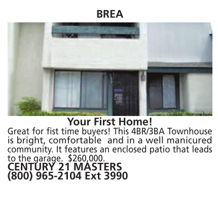 Great for fist time buyers! This 4BR/3BA Townhouse is bright, comfortable and in a well manicured community. It features an enclosed patio that leads to the garage. $260,000. CENTURY 21 MASTERS (800) 965-2104 Ext 3990
