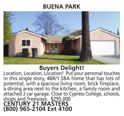BUENA PARK Buyers Delight! Location, Location, Location! Put your personal touches in this single story, 4BR/1.5BA home that has lots of potential, with a spacious living room, brick fireplace, a dining area next to the kitchen, a family room and attached 2 car garage. Close to Cypress College, schools, shops and freeways. $295.000 CENTURY 21 MASTERS (800) 965-2104 Ext 4100