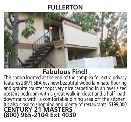 This condo located at the end of the complex for extra privacy features 2BR/1.5BA has new beautiful wood laminate flooring and granite counter tops very nice carpeting in an over sized upstairs bedroom with a great walk in closet and a half bath downstairs with a comfortable dining area off the kitchen. It’s also close to shopping and plenty of restaurants. $199,000 CENTURY 21 MASTERS (800) 965-2104 Ext 4030