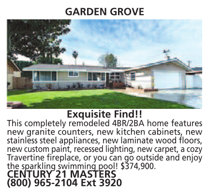 This completely remodeled 4BR/2BA home features new granite counters, new kitchen cabinets, new stainless steel appliances, new laminate wood floors, new custom paint, recessed lighting, new carpet, a cozy Travertine fireplace, or you can go outside and enjoy the sparkling swimming pool! $374,900. CENTURY 21 MASTERS (800) 965-2104 Ext 3920