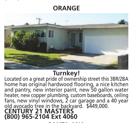 Located on a great pride of ownership street this 3BR/2BA home has original hardwood flooring, a nice kitchen and pantry, new interior paint, new 50 gallon water heater, new copper plumbing, custom baseboards, ceiling fans, new vinyl windows, 2 car garage and a 40 year old avocado tree in the backyard. $449,000. CENTURY 21 MASTERS (800) 965-2104 Ext 4060