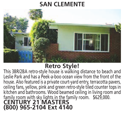 SAN CLEMENTE Retro Style! This 3BR/2BA retro-style house is walking distance to beach and Leslie Park and has a Peek-a-boo ocean view from the front of the house. Also featured is a private court-yard entry, terracotta pavers, ceiling fans, yellow, pink and green retro-style tiled counter tops in kitchen and bathrooms. Wood beamed ceiling in living room and family room with sky lights in the family room. $629,000. CENTURY 21 MASTERS (800) 965-2104 Ext 4140