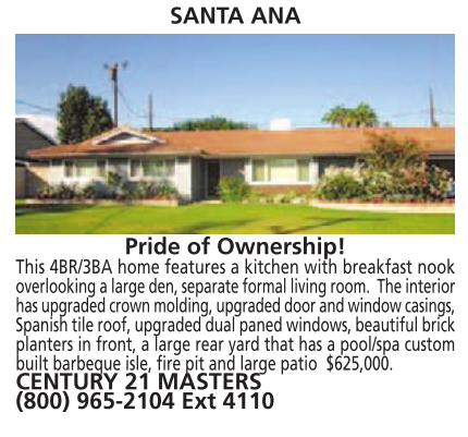 This 4BR/3BA home features a kitchen with breakfast nook overlooking a large den, separate formal living room. The interior has upgraded crown molding, upgraded door and window casings, Spanish tile roof, upgraded dual paned windows, beautiful brick planters in front, a large rear yard that has a pool/spa custom built barbeque isle, fire pit and large patio $625,000. CENTURY 21 MASTERS (800) 965-2104 Ext 4110