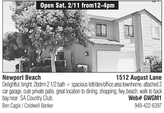Newport Beach 1512 August Lane Delightful, bright, 2bdrm 2 1/2 bath + spacious loft/den/office area townhome. attached 2 car garage. cute private patio. great location to dining, shopping, fwy.,beach. walk to back bay.near SA Country Club. Web# GWGM1 Ben Cagle / Coldwell Banker 949-422-6397