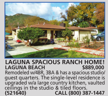 LAGUNA SPACIOUS RANCH HOME! LAGUNA BEACH $889,000 Remodeled w/4BR, 3BA & has a spacious studio/ guest quarters. The single-level residence is upgraded w/a large country kitchen, vaulted ceilings in the studio & tiled floors. (521640) CALL (800) 387-1447