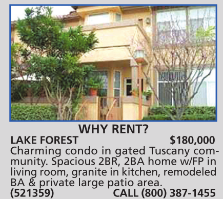 LAKE FOREST $180,000 Charming condo in gated Tuscany community. Spacious 2BR, 2BA home w/FP in living room, granite in kitchen, remodeled BA & private large patio area. (521359) CALL (800) 387-1455