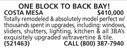 ONE BLOCK TO BACK BAY! COSTA MESA $410,000 Totally remodeled & absolutely model perfect w/ thousands spent in upgrades, including: windows, sliders, shutters, lighting, kitchen & all 3BA’s exquisitely upgraded w/travertine & tile. (521463) CALL (800) 387-7940
