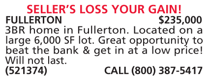 FULLERTON $235,000 3BR home in Fullerton. Located on a large 6,000 SF lot. Great opportunity to beat the bank & get in at a low price! Will not last. (521374) CALL (800) 387-5417