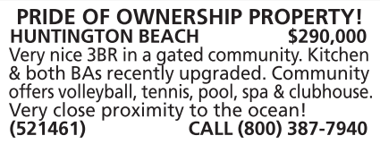 PRIDE OF OWNERSHIP PROPERTY! HUNTINGTON BEACH $290,000 Very nice 3BR in a gated community. Kitchen & both BAs recently upgraded. Community offers volleyball, tennis, pool, spa & clubhouse. Very close proximity to the ocean! (521461) CALL (800) 387-7940