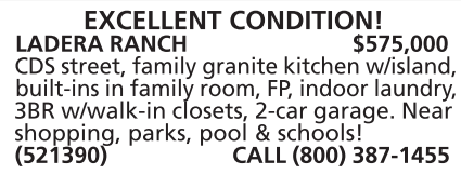 LADERA RANCH $575,000 CDS street, family granite kitchen w/island, built-ins in family room, FP, indoor laundry, 3BR w/walk-in closets, 2-car garage. Near shopping, parks, pool & schools! (521390) CALL (800) 387-1455