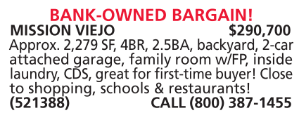 MISSION VIEJO $290,700 Approx. 2,279 SF, 4BR, 2.5BA, backyard, 2-car attached garage, family room w/FP, inside laundry, CDS, great for first-time buyer! Close to shopping, schools & restaurants! (521388) CALL (800) 387-1455