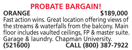 PROBATE BARGAIN! ORANGE $189,000 Fast action wins. Great location offering views of the streams & waterfalls from the balcony. Main floor includes vaulted ceilings, FP & master suite. Garage & laundry. Chapman University. (521600) CALL (800) 387-7922