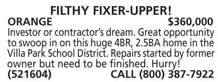 FILTHY FIXER-UPPER! ORANGE $360,000 Investor or contractor’s dream. Great opportunity to swoop in on this huge 4BR, 2.5BA home in the Villa Park School District. Repairs started by former owner but need to be finished. Hurry! (521604) CALL (800) 387-7922
