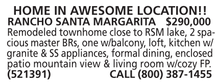 HOME IN AWESOME LOCATION!! RANCHO SANTA MARGARITA $290,000 Remodeled townhome close to RSM lake, 2 spacious master BRs, one w/balcony, loft, kitchen w/ granite & SS appliances, formal dining, enclosed patio mountain view & living room w/cozy FP. (521391) CALL (800) 387-1455