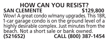 HOW CAN YOU RESIST? SAN CLEMENTE $129,800 Wow! A great condo w/many upgrades. This 1BR, 1-car garage condo is on the ground level of a highly desirable complex. Just minutes from the beach. Not a short sale or bank owned. (521652) CALL (800) 387-1454