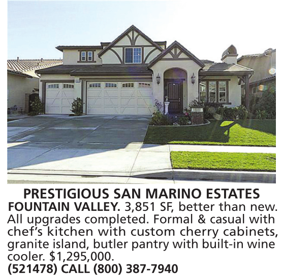 PRESTIGIOUS SAN MARINO ESTATES FOUNTAIN VALLEY. 3,851 SF, better than new. All upgrades completed. Formal & casual with chef’s kitchen with custom cherry cabinets, granite island, butler pantry with built-in wine cooler. $1,295,000. (521478) CALL (800) 387-7940
